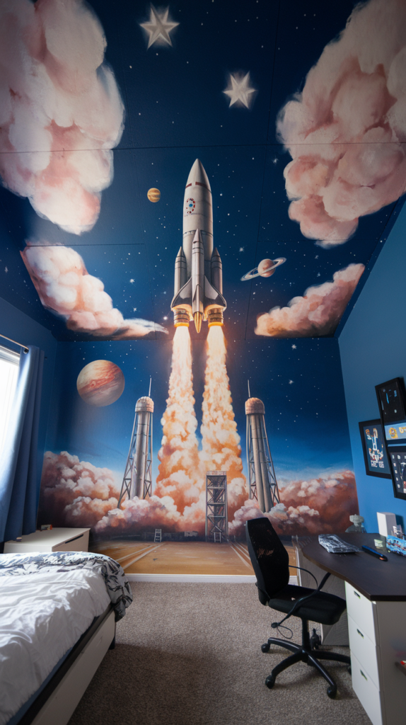 Paint a giant rocket blasting off with a trail of smoke and flames leading across the ceiling. Add planets or stars to extend the theme. Use 3D details like cotton clouds or glow-in-the-dark stars for extra fun. A thrilling option for space fans.