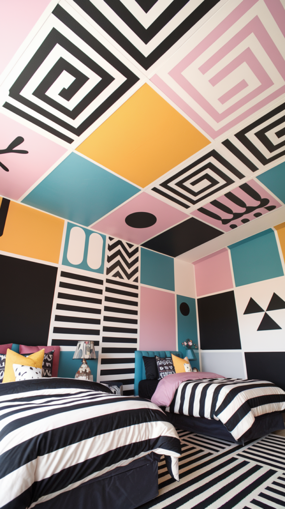 Use bold geometric patterns in contrasting colors like black and white or pastels. This modern design works well for both toddlers and tweens. Pair with matching bedding or rugs for a cohesive look. A stylish and trendy ceiling option.