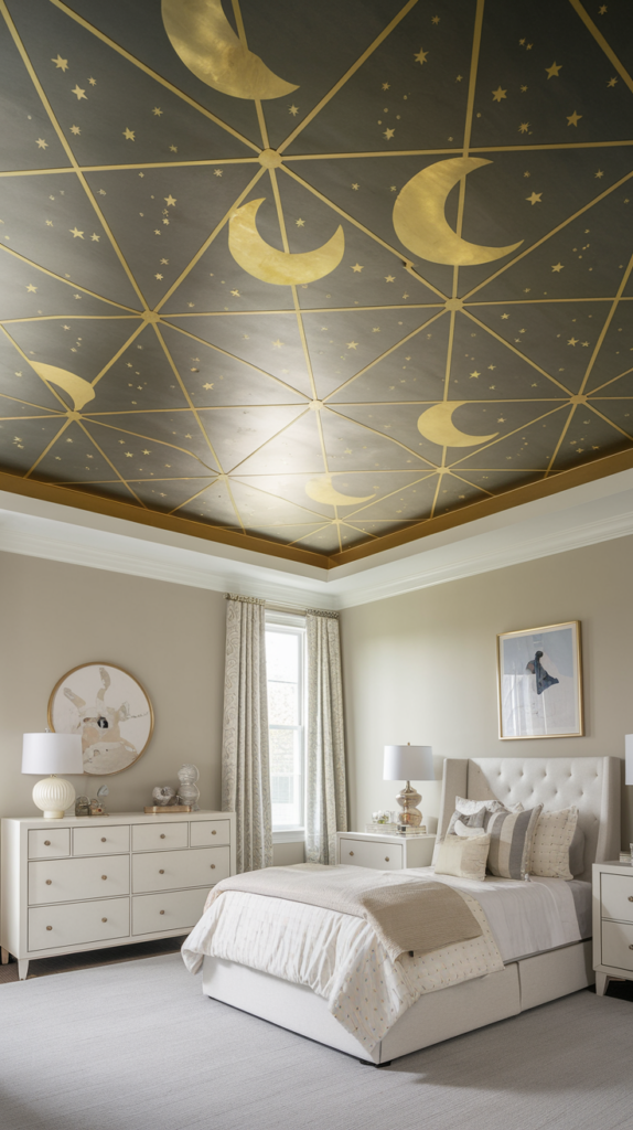 Add metallic gold or silver details like stars, moons, or geometric patterns. These reflective designs catch the light beautifully. Pair with neutral walls to let the ceiling shine. A sophisticated choice for older kids.