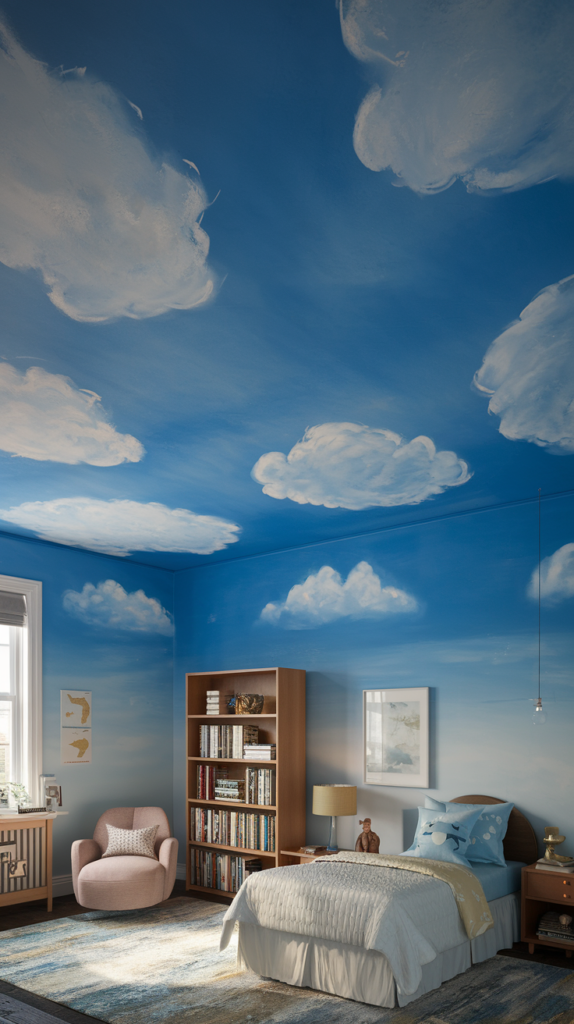 Paint a blue ceiling with fluffy white clouds for a serene, dreamy effect. Use sponges or stencils to achieve realistic textures. Add recessed lighting to mimic the sunlight breaking through clouds. A soothing design for a peaceful bedtime atmosphere.