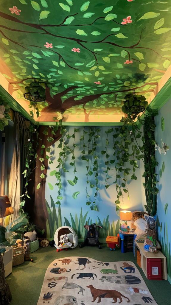 Paint a jungle canopy on the ceiling and add faux vines hanging down. Include 3D butterflies, birds, or monkeys for extra dimension. Use a variety of green tones for realism. Perfect for kids who love wildlife.