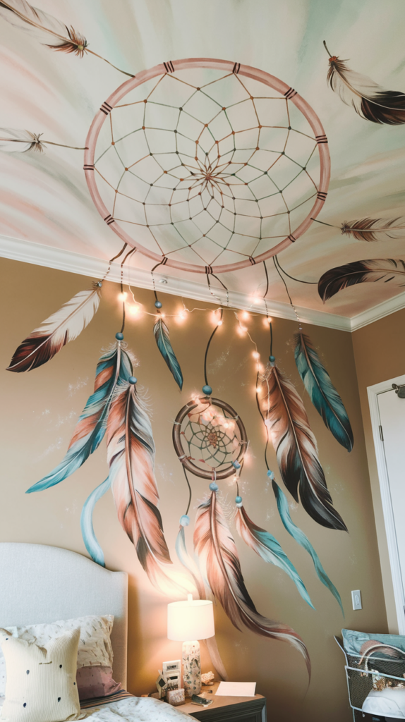 Paint a large dreamcatcher in soft pastel tones, complete with feathers and intricate details. Add actual feather décor or string lights to enhance the look. This design is calming and doubles as a symbol of sweet dreams. Perfect for a serene, bohemian bedroom.