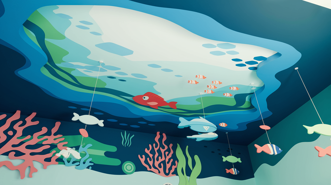 Create an underwater world with a painted ceiling featuring fish, coral, and waves. Use soft blues and greens to give the space a calming effect. Add hanging décor like fish-shaped mobiles for a 3D effect. Perfect for kids who love the ocean.
