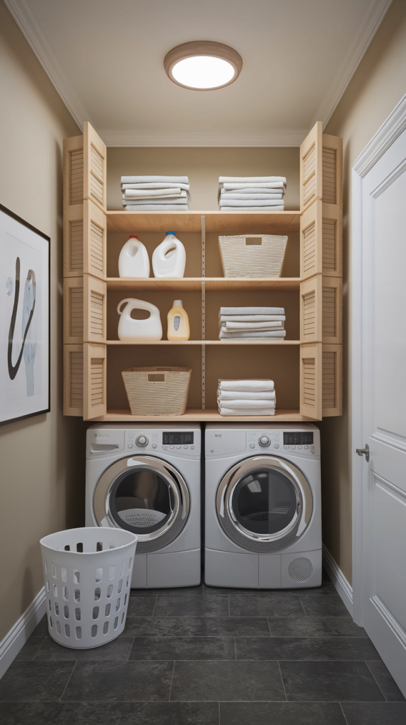 Install inexpensive floating shelves above your washer and dryer to maximize vertical space. Use them to store laundry detergent, fabric softener, and baskets for smaller items. Choose unfinished wood for a rustic look or paint them to match your walls. Open shelving keeps everything accessible while adding style. A simple project that costs less than $50.