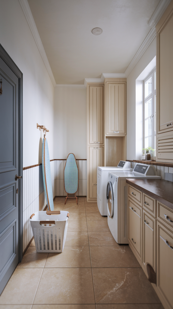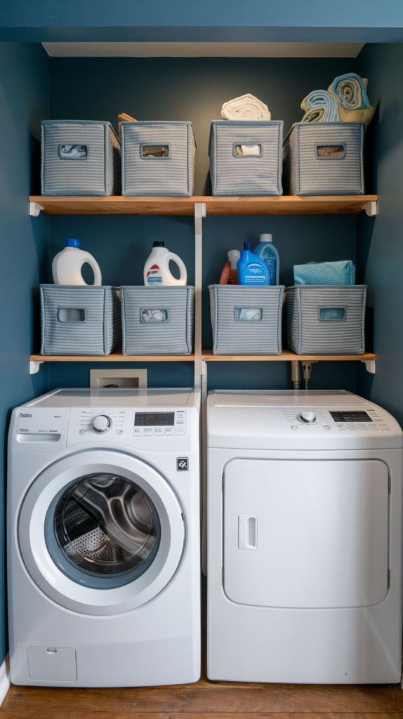 Organize supplies in matching baskets or bins to give your laundry room a cohesive look. Label each basket for items like “detergent,” “stain removers,” or “cleaning rags.” Use wire or wicker baskets for a farmhouse vibe or plastic bins for a modern feel. This keeps your space tidy and visually appealing. Affordable options can be found at dollar stores or online.
