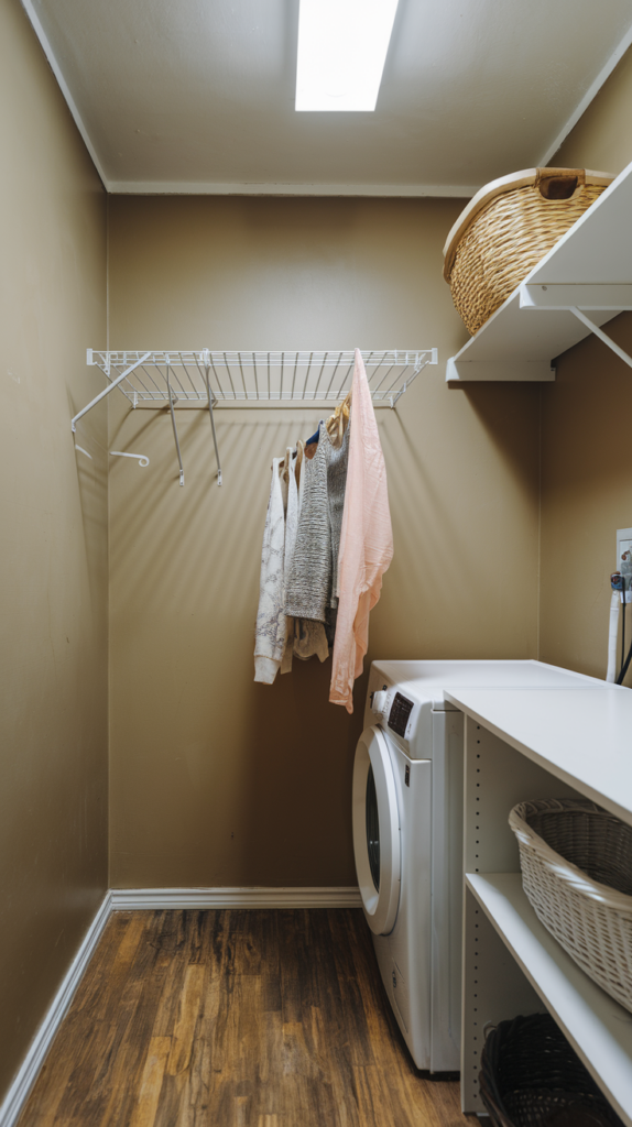 Attach a tension rod or inexpensive metal bar between two walls or under a shelf. Use it to hang clothes that need to air dry or be steamed. Pair it with matching hangers for a clean, organized look. This simple addition is both functional and stylish. Ideal for small laundry rooms with limited space.