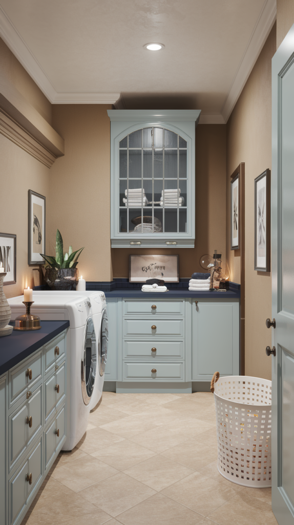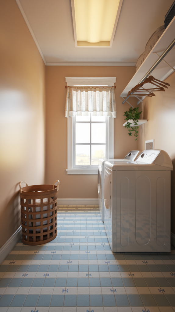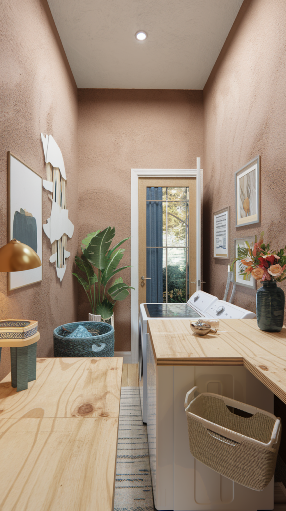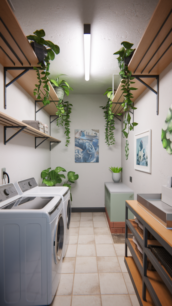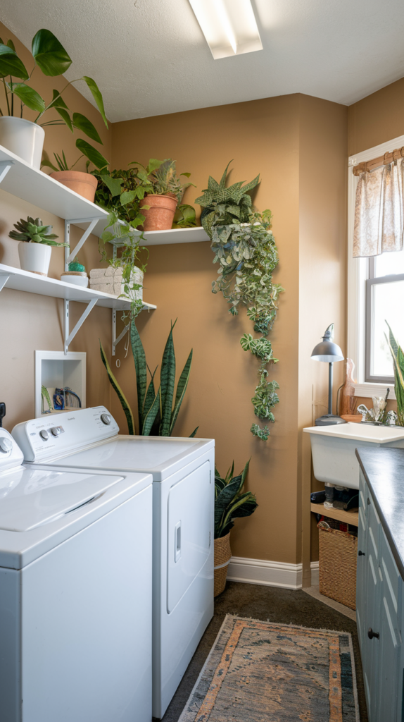 Bring life to your laundry room with low-maintenance plants like pothos, succulents, or snake plants. Use small pots that fit on shelves or hang planters from the ceiling. Plants improve air quality and add a fresh, natural vibe to the space. Faux plants are also an option for low-light areas. A budget-friendly way to brighten the room.