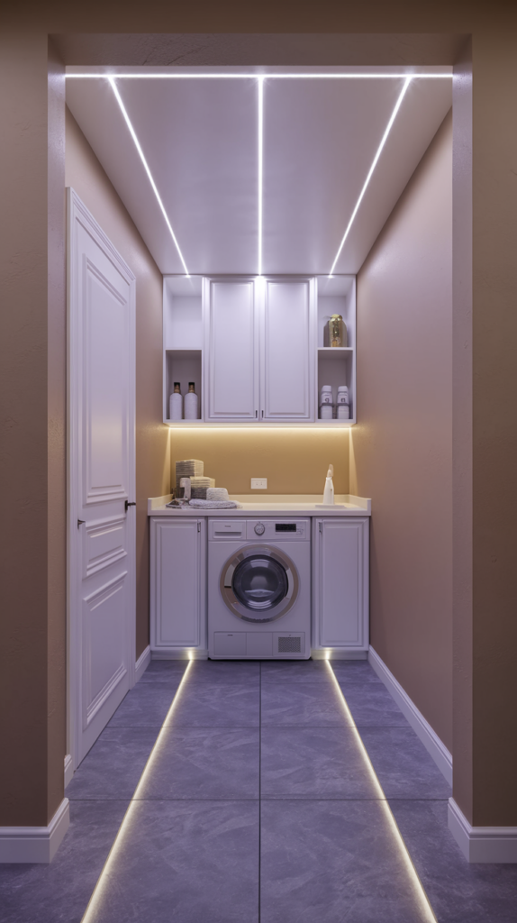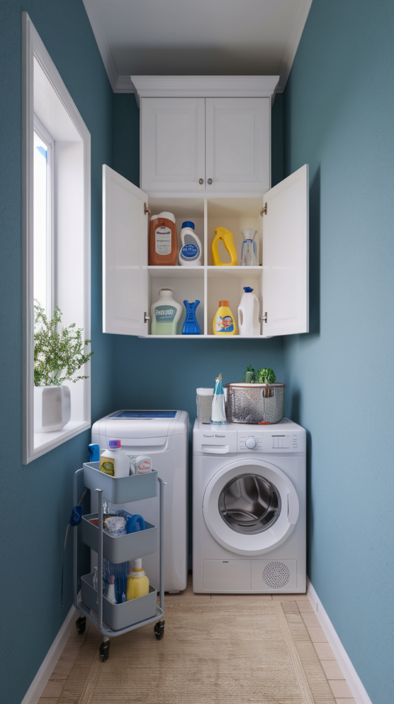 Use under-appliance storage drawers or slim rolling carts for hidden organization. Store items like extra detergent, dryer sheets, or cleaning tools. This maximizes unused space and keeps your room tidy. Hidden storage solutions are both practical and affordable. Ideal for small laundry rooms with limited space.