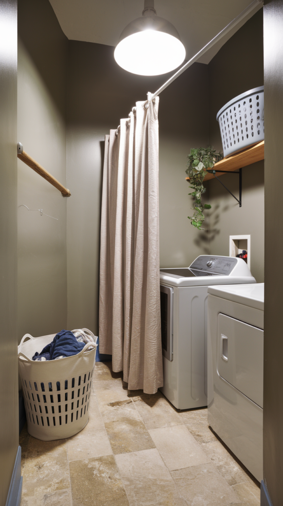 Install a simple tension rod and hang a curtain to conceal your washer and dryer. Choose fabric that complements your décor, such as a fun pattern or neutral linen. This is especially helpful in multipurpose spaces where the laundry area is visible. A stylish solution for keeping your room looking tidy. Easy to install and change as needed.