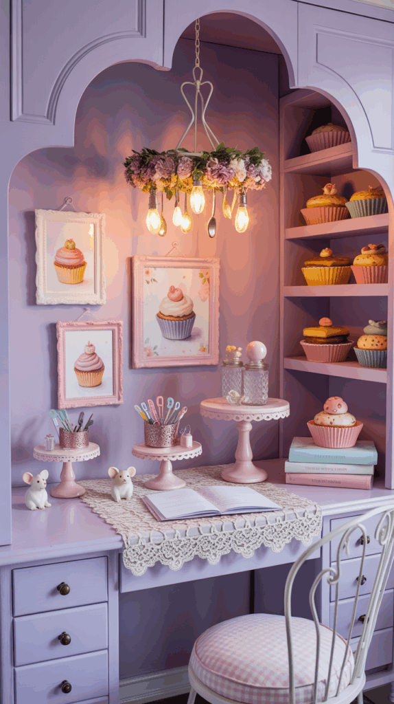 Design a calming, bakery-inspired nook with soft lavender walls, a white wrought iron desk, and scalloped shelves filled with faux pastries and tea tins. Add a pastel gingham chair cushion and a soft crochet blanket draped over the back. Use mini cake stands to organize stationery or display crystal-cut jars of pastel push pins and paperclips. Hang watercolor cupcake prints in mismatched frames on the wall. Place a cream lace table runner over the desk and tuck tiny ceramic mice into the corners as sweet surprises. A dusty lilac floor pouf creates a reading corner beside stacked baking books and a teacup planter. Hang a chandelier made from antique teaspoons and floral garlands. Add a wall clock shaped like a cookie for an unexpected, playful twist. It’s a cozy, creative retreat perfect for journaling, sketching, or dream plotting.