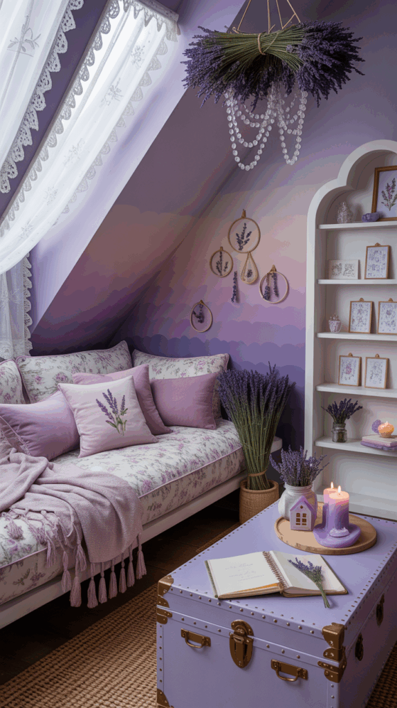 Up in the attic? Turn a loft or upper alcove into a lavender-scented escape. Paint the slanted walls in a gradient of frosted lavender to dusty lilac. Hang a chandelier made from clear beads and dried lavender bundles. Use a pastel trunk as a coffee table, topped with hand-bound notebooks and a candle shaped like a cottage. Place a scalloped white bookcase along one wall with soft lighting and tiny framed embroidery hoops as décor. Add a lounge mattress dressed in floral sheets, tasseled throws, and vintage pillowcases. Use lace-trimmed curtains with pressed lavender flowers embedded in the fabric for privacy. Play soft harp music or ambient forest sounds from a tucked-away Bluetooth speaker. It’s the perfect blend of romance, relaxation, and rustic charm.