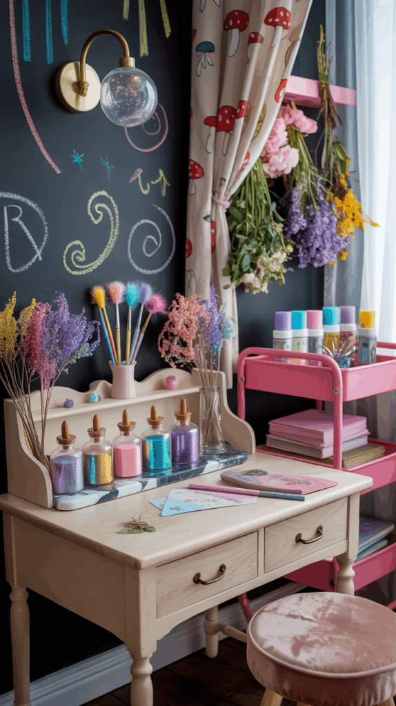 Create a magical workspace for kids or kids-at-heart with soft lilac walls, a mushroom-patterned curtain, and a desk styled like a vintage apothecary. Line shelves with pastel-labeled “potions” (glitter-filled vials, colored sand jars, and dried flower mixes). Add a chalkboard wall with swirling chalk runes and doodles. Use a faux marble tray to hold “mixing tools” like pastel brushes, pearl spoons, and fairy wands. Include a bubblegum pink rolling cart filled with sparkly glue, handmade spellbooks, and pastel parchment paper. Hang bundles of herbs and silk flowers from the ceiling like drying magical ingredients. Place a stool shaped like a toadstool with a plush velvet top. Add a soft gold wall sconce shaped like a crystal orb. The vibe is part science lab, part enchanted cottage. Kids will invent spells and style.