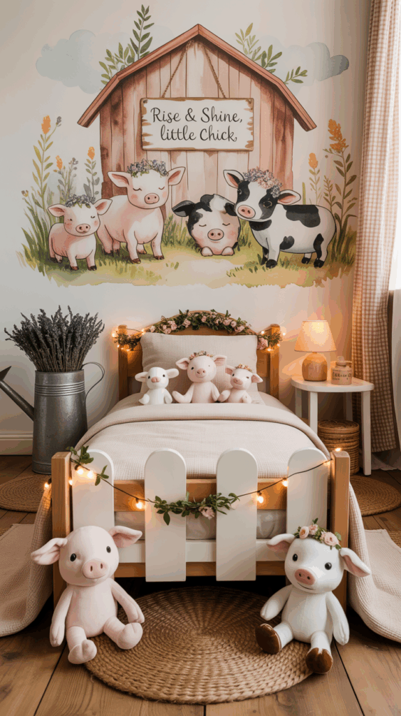 Design a gentle, animal-themed room with a pastel barnyard palette—dusty pinks, sky blues, soft yellows, and buttercream. Paint a barn silhouette on the wall and fill it with sleepy farm animals in a watercolor style—tiny piglets, fuzzy lambs, and sleepy cows wearing flower crowns. Use hay-colored rugs, gingham curtains, and a vintage watering can holding dried lavender to bring the feel to life. Add a picket fence bed frame in white, wrapped in floral garland and fairy lights. Use pastel wooden crates as storage bins labeled “Feed” or “Eggs” for toys and books. Hang a mobile with plush pastel farm animals floating overhead. Add a handmade sign that reads “Rise & Shine, Little Chick.” It’s part storybook, part farmstead fantasy—and 100% charming.