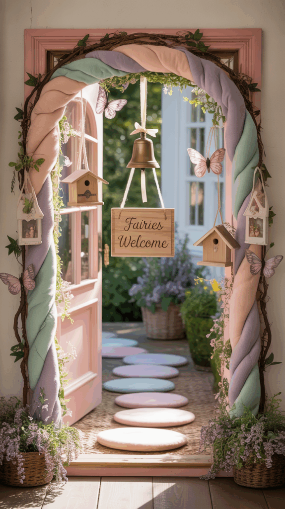 Transform an ordinary doorway into a whimsical entrance with pastel charm. Wrap the frame in twisted fabric “vines” of blush, mint, and lavender. Hang mini wooden birdhouses in soft tones from the top, with faux butterflies perched here and there. Add a hanging bell with a ribbon pull and a wooden plaque that says “Fairies Welcome.” Just inside, line the floor with soft stepping stones made of cushiony felt in pastel florals. Kids can hop their way into the room like a garden trail. It’s a grand cottagecore entrance that turns even opening a door into an experience.