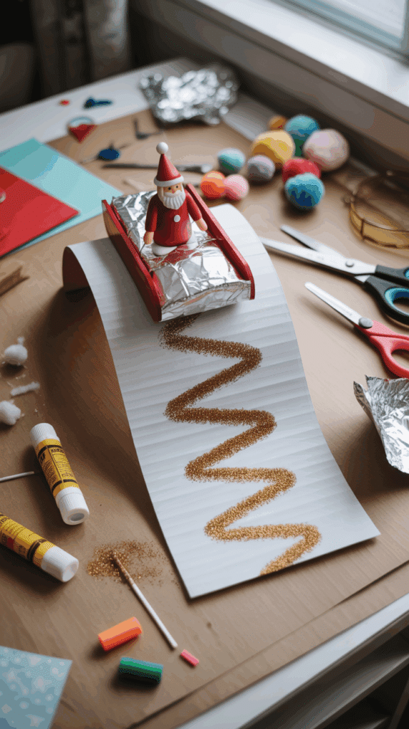 Kids glue a small plastic Santa figurine (or a flat cutout) onto a cardboard “sled” covered in aluminum foil. Then they create a snowy slide from a long sheet of poster board folded into a gentle slope. They draw glitter trails with glue so it shines like Santa is speeding across ice. When they place Santa at the top and let him go, he slides all the way down in a sparkly path. Kids race their Santas and adjust the slope to go faster. This craft combines engineering, decoration, and pure chaos. It becomes the centerpiece of any holiday craft day.