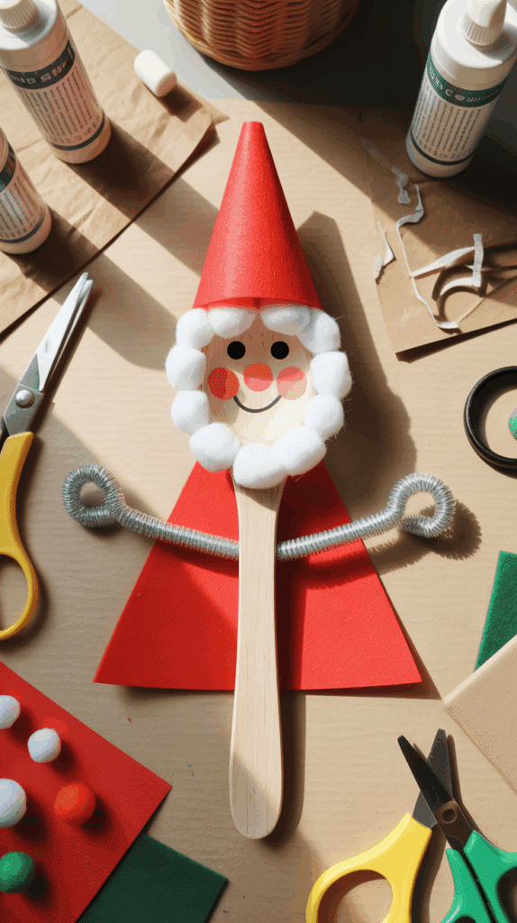 This Santa starts with a wooden spoon painted rosy peach at the rounded end for the face. Kids glue a triangle of red felt behind it to form a cloak that swishes when they wave the spoon around. A cotton ball beard gets stretched longer than normal because kids love dramatic beards. The hat is a piece of red felt rolled into a cone, hot glued on by an adult because it’s wiggly. Kids draw the tiniest smile with a fine tip marker. We wrap silver pipe cleaners around the handle to give Santa “sparkle sleeves.” Puppet shows always erupt after this craft, usually involving Santa negotiating with reindeer. These spoons last a surprisingly long time. Some families plant them in plants as decorations afterward. They look hilarious peeking out from behind leaves.