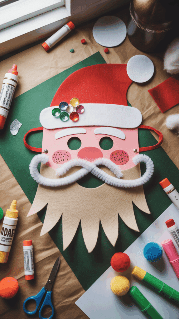 Kids cut a Santa face mask shape from cardstock, but the secret is the mustache. They attach two white pipe cleaners curled at the ends with brads so the mustache wiggles when they talk. The beard is fringed felt that sways with every step. Kids color rosy cheeks and decorate the hat with sticker jewels for sparkle. An elastic band lets them wear the mask, but many kids end up holding it like a photo booth prop. When the mustache wiggles, it looks like Santa is telling jokes. This craft always leads to noisy giggles and chaotic pretend play.