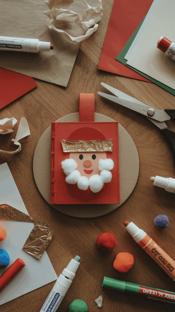 Kids fold a tiny red paper book that fits in the palm of a hand. The cover gets a cheerful Santa face with a cotton beard and gold foil hat trim. Inside, kids draw mini comic panels telling a silly Santa story. The book gets glued to a cardboard circle decorated like a giant badge. Add a safety pin on the back so kids can wear it proudly on their shirts. It becomes a walking craft show and conversation starter. Teachers love how it combines creativity and writing. Kids love announcing their “Santa author badge” to everyone who walks by.