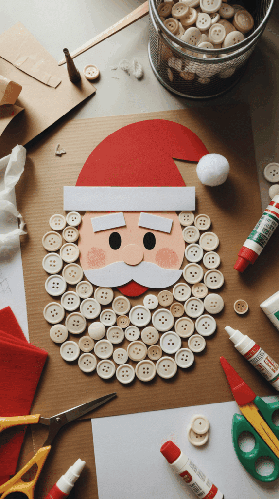 This Santa uses a large cardboard circle for the face, but the beard is made entirely out of mismatched white buttons. Kids glue them on in tight clusters so it looks dimensional and satisfyingly bumpy. They stack buttons on top of each other in some spots for extra fluff. The hat gets trimmed with felt and a pom pom the size of a golf ball. Kids add rosy cheeks with chalk, smudging them for a realistic blush. The finished craft looks unexpectedly fancy. Teachers usually end up hanging these in hallways because they’re too good to send home right away. Kids love digging through the button bin like treasure hunters.
