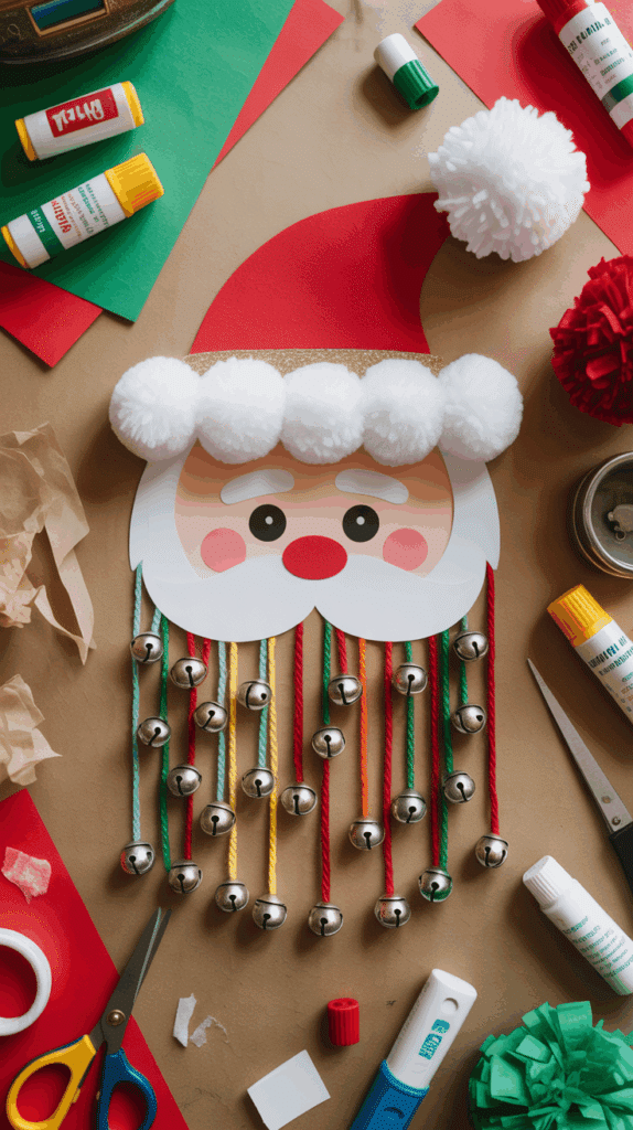 Kids decorate the top half of a cardboard circle as Santa’s face. Below it, instead of drawing a beard, they punch holes and tie on strings of mini jingle bells. The bells hang like a curtain beard that sparkles and makes noise with every movement. The hat gets glitter trim and a soft cotton pom. When kids shake the craft, Santa becomes a musical instrument. Some kids add eyebrows that wiggle, which somehow makes the jingling funnier. This one is loud, festive, and impossible for kids to put down. It also makes a great classroom parade prop.
