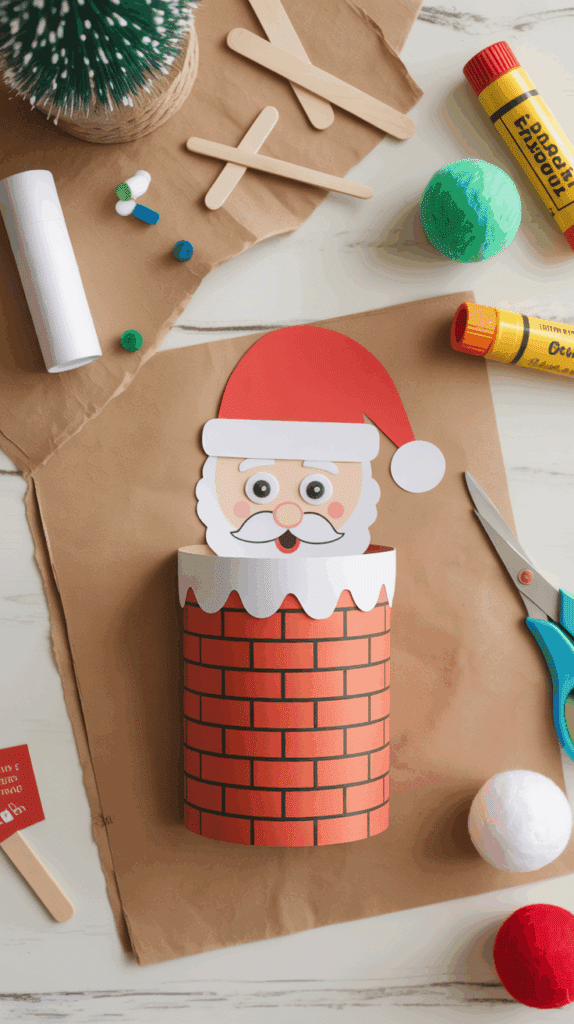 Kids build a paper chimney from a toilet paper roll wrapped in brick patterned paper. Then they make a mini Santa on a popsicle stick. When they push the stick up, Santa pops out of the chimney with wide eyes and a stunned expression. When they let go, he drops back down like he’s stuck again. They add cotton “snow” on the chimney ledge for texture. Some kids draw reindeer peeking over the edge, spying on Santa. You can glue the whole thing to a cardboard snow hill so it stands upright. It becomes a little puppet show where Santa keeps getting stuck, and for some reason that absolutely destroys kids in laughter.