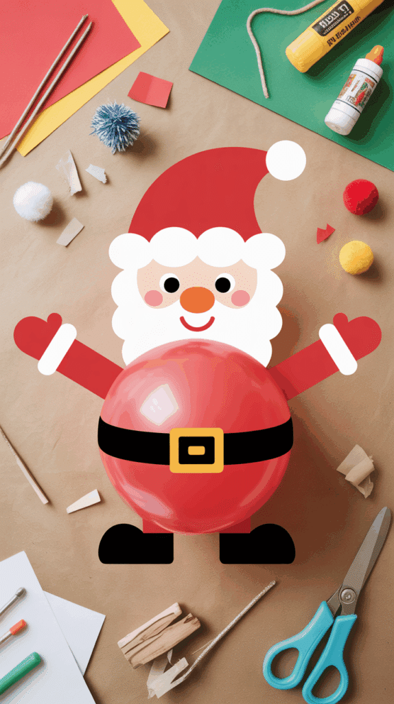 Kids draw Santa’s head and arms on cardstock, then tape them to the top of a red balloon. When the balloon is blown up, it becomes Santa’s huge round belly. They add a black paper belt and gold buckle right to the balloon. When the kids tap it, Santa wobbles back and forth like a Weeble toy. The whole thing sits inside a paper stand decorated like a snowy hill. Kids love making his belly wiggle while shouting “Jolly belly time.” It’s silly, quick, and great for groups.