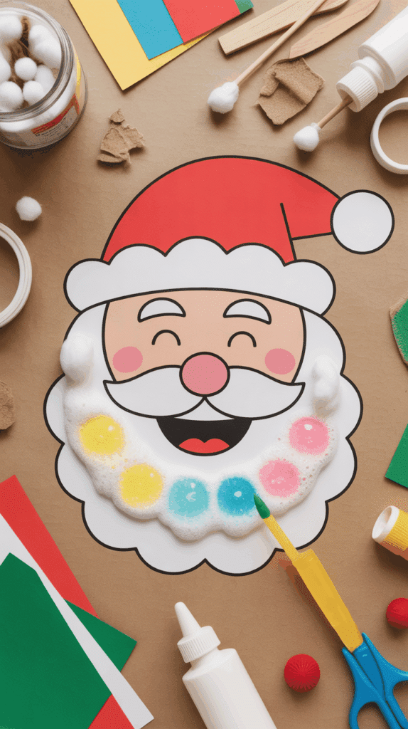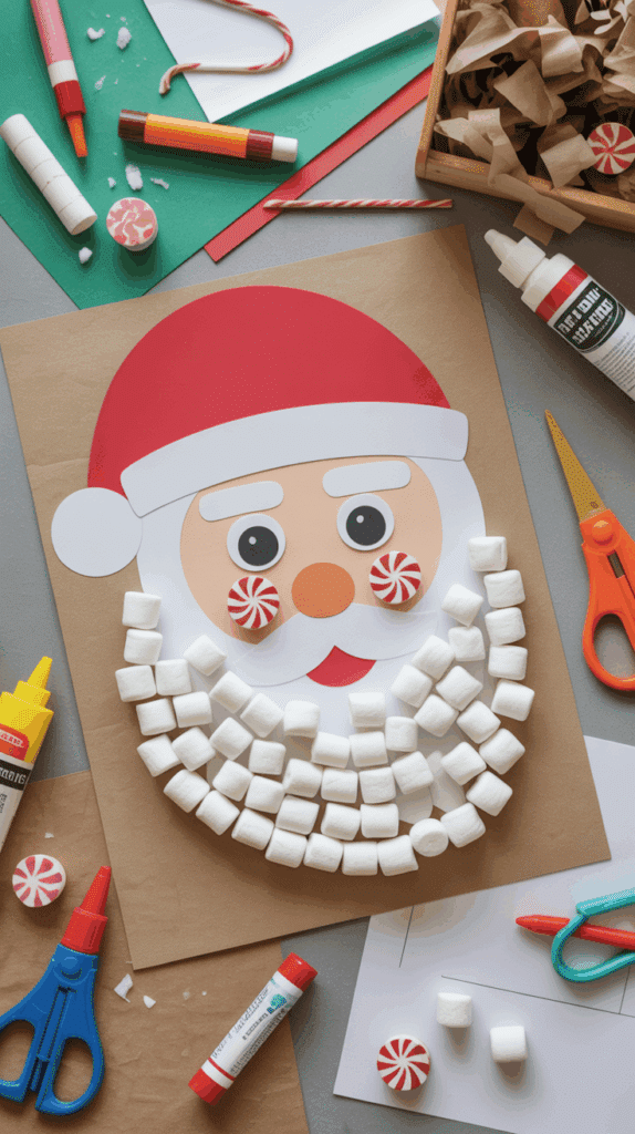 This craft starts with a giant Santa face outline printed on cardstock. Instead of cotton, kids glue on real mini marshmallows to form the beard. The texture is irresistible. They inevitably eat two or three, and honestly that is part of the fun. To add detail, they draw peppermint swirls in the cheeks and color the hat with glitter crayons. We finish by spraying the whole beard lightly with craft sealant so it lasts all season. The result looks like Santa dipped his chin in hot cocoa foam. Kids hang them on the fridge like a proper holiday portrait. It smells faintly sweet for days.