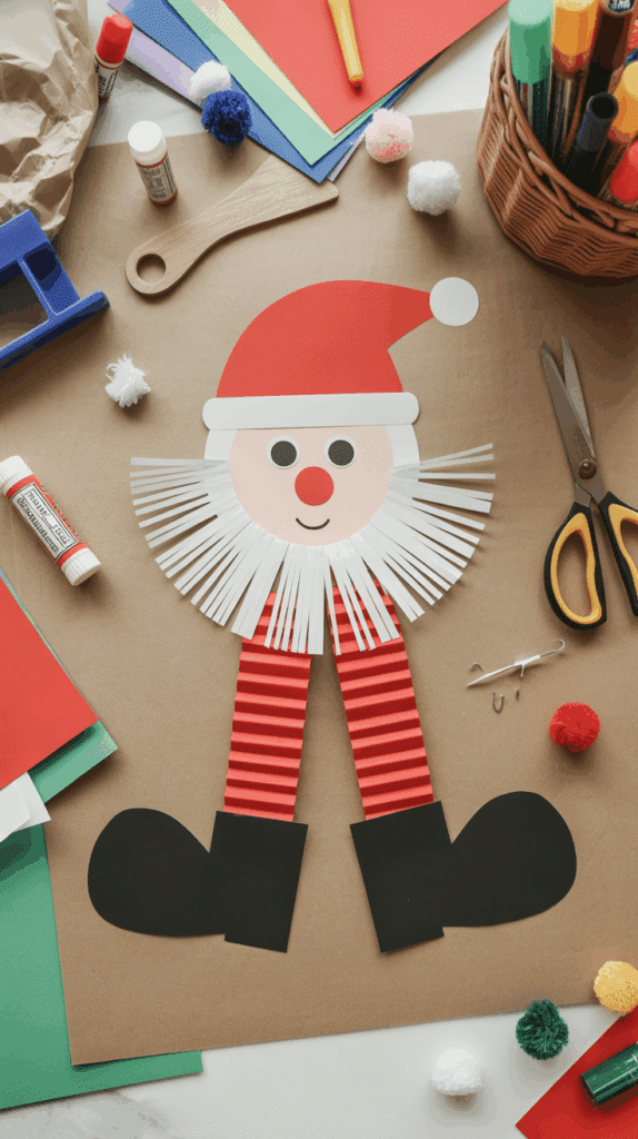 This Santa uses a big circular face at the top and two long accordion folded legs dangling below. Kids attach giant black paper boots at the end that flap when you shake it. They always make the boots huge because it makes Santa look like he is wearing clown shoes. The beard is fringed paper so it swings with the legs, giving the whole thing a goofy vibe. We glue a jumbo craft stick behind the head so kids can make him “dance.” When they shake it, the legs bounce like a holiday puppet. It becomes an instant parade toy. This one is especially good for classrooms because the laughs echo all the way down the hallway.
