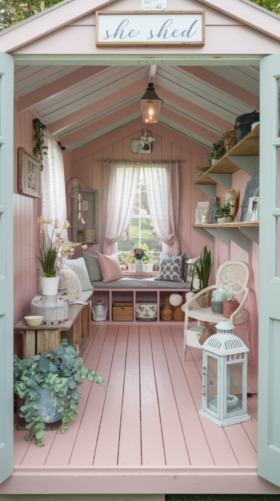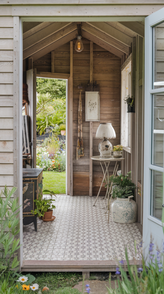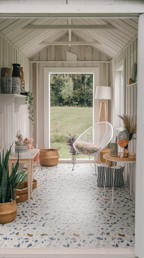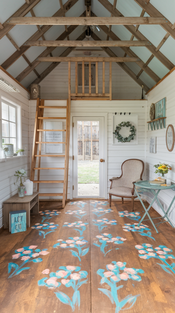 Instead of traditional paint, use chalk paint on wood or concrete floors for a matte, velvety finish. Soft pastels like blush pink, sage green, or powder blue give the space a dreamy, delicate vibe. Seal with a matte polyurethane to protect against wear and tear. Perfect for a romantic, shabby chic she shed. A gentle and inviting flooring idea for those who love soft aesthetics.