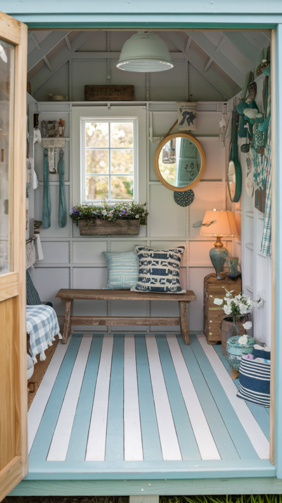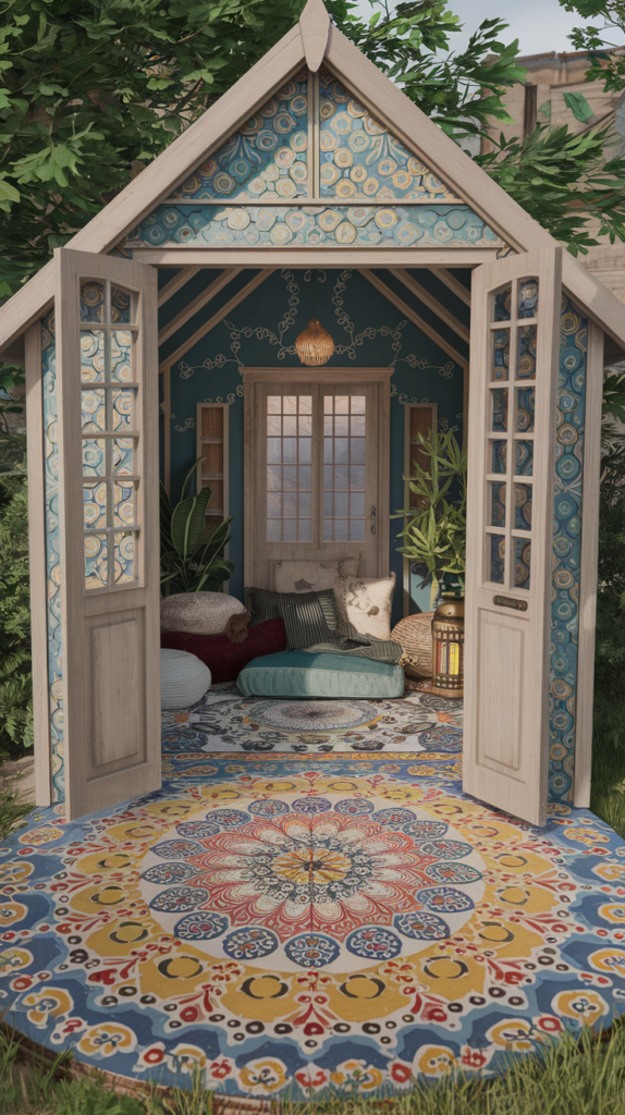 If you love intricate patterns, consider hand-painting a mandala or Moroccan-inspired motif onto a concrete or wood floor. Use stencils to ensure symmetry and finish with a protective topcoat to preserve the design. The result is a stunning, one-of-a-kind floor that adds a touch of exotic charm. Pair it with warm-toned cushions and lantern lighting for an inviting space. A bold flooring choice that makes your she shed feel like a sanctuary!