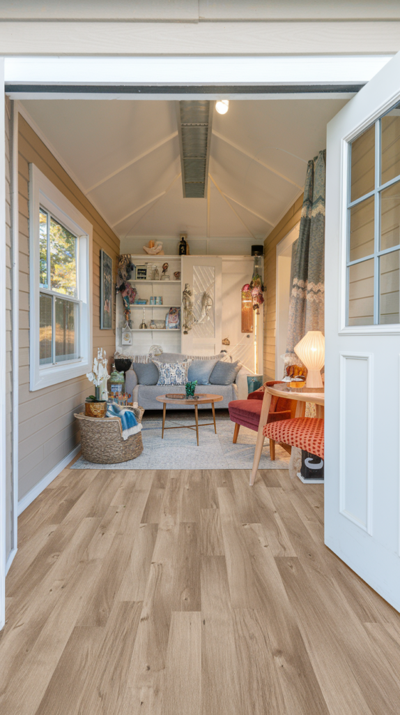 Get the look of wood or stone without the cost by using LVP flooring. It’s waterproof, easy to install, and highly durable, making it ideal for high-traffic she sheds. Choose a light oak or weathered gray finish for a modern farmhouse aesthetic. Many styles come in peel-and-stick or click-lock options for DIY-friendly installation. A stylish yet low-maintenance flooring solution.
