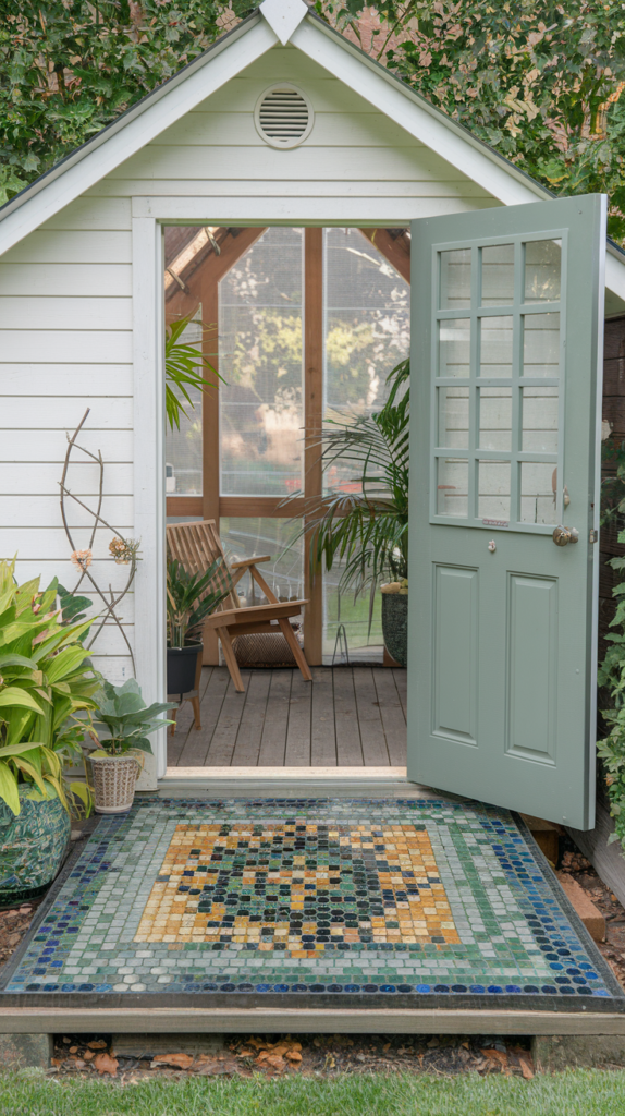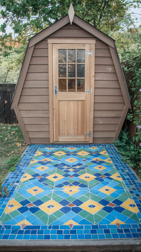 For a creative and artistic touch, use mosaic tiles in bright, fun patterns. Moroccan-inspired designs or geometric shapes can add personality and vibrancy to your she shed. Tiles are easy to clean and perfect for crafting spaces or garden retreats. Mix and match colors to create a unique floor that reflects your personality. A fantastic choice for a bold and eclectic she shed.