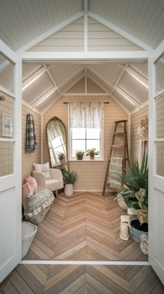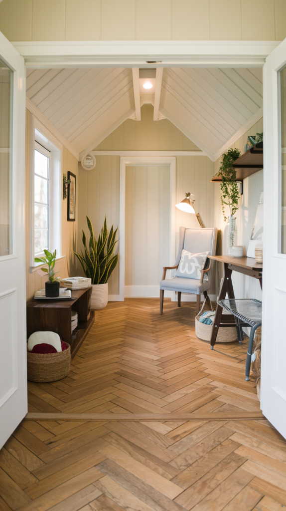 Add visual interest with a bold chevron wood floor design. Whether you use real wood, laminate, or luxury vinyl planks, the pattern adds depth and elegance to the space. Pair it with soft, neutral walls to make the flooring the focal point. It works beautifully in both modern and rustic she sheds. A stylish way to elevate your retreat!