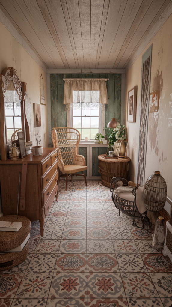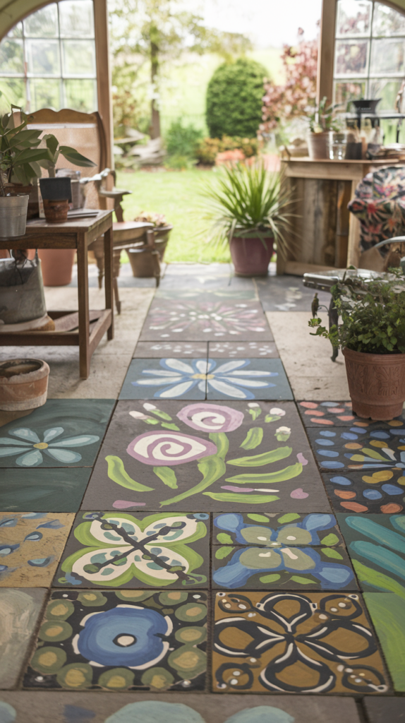 Turn plain concrete or ceramic tiles into works of art with hand-painted designs. Use soft pastels for a whimsical feel or bold geometric patterns for a modern twist. Once sealed, these tiles become water-resistant and long-lasting, making them a great option for high-traffic she sheds. This DIY-friendly project allows you to create a truly one-of-a-kind floor. Ideal for creative souls who love personalizing their space!