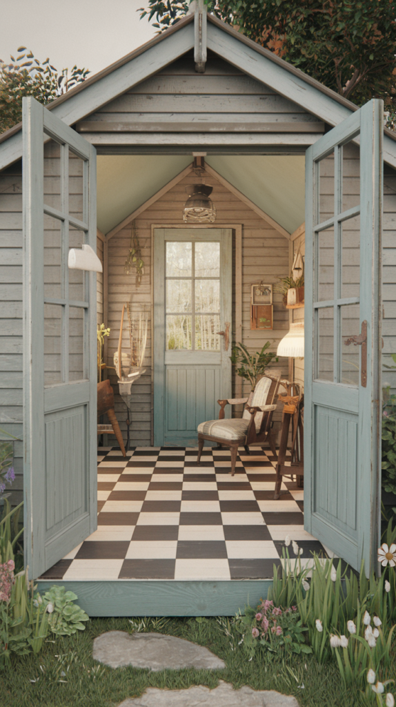 Create a vintage-inspired space with a classic checkerboard floor design. Use contrasting colors like black and white for a bold statement or soft pastels for a charming cottage feel. This works beautifully on wooden or concrete floors with a good-quality paint and sealant. The timeless pattern pairs well with shabby chic or retro-style she sheds. A creative and nostalgic flooring choice!