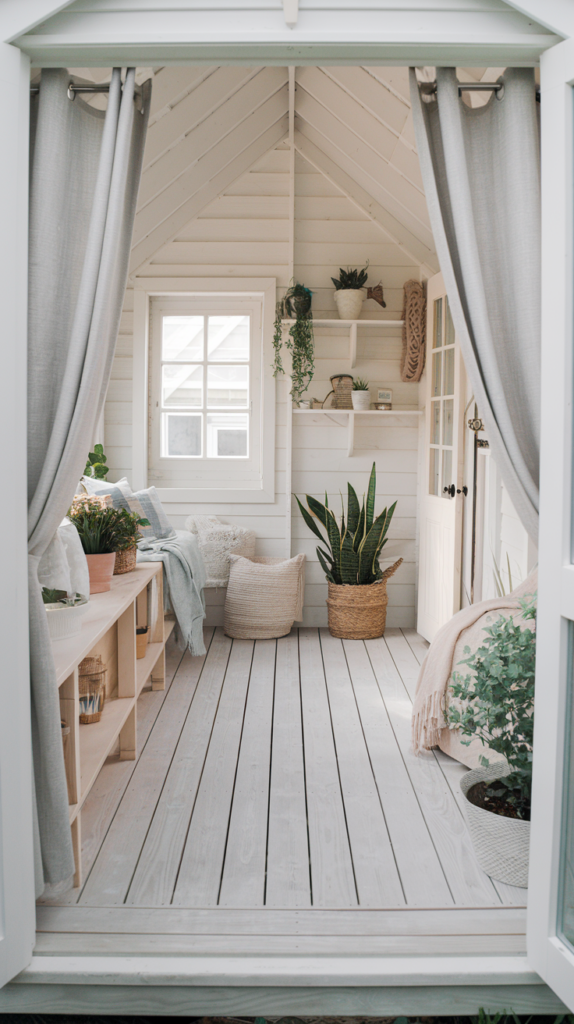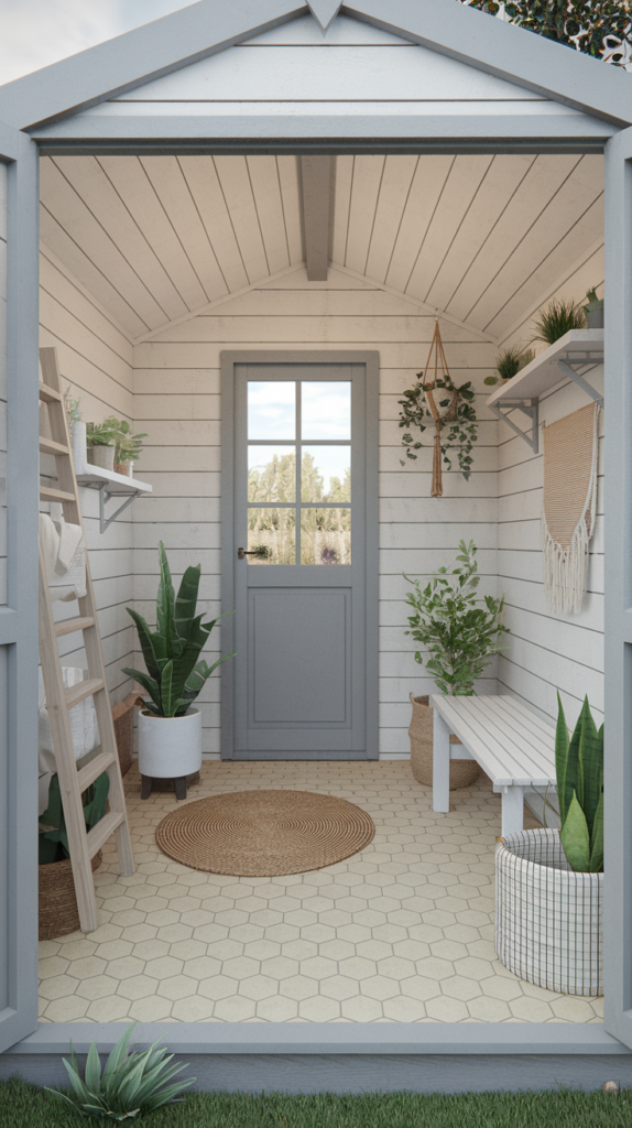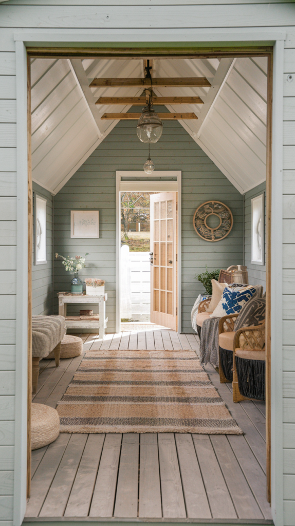 If you love the farmhouse aesthetic, extend the shiplap look to your flooring. Wide plank shiplap wood flooring creates a rustic, homey atmosphere. Opt for soft gray or classic white to keep the space feeling light. Add cozy rugs to balance the texture and warmth. A charming, cozy flooring idea perfect for cottage-style she sheds.