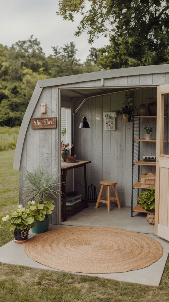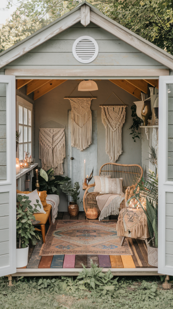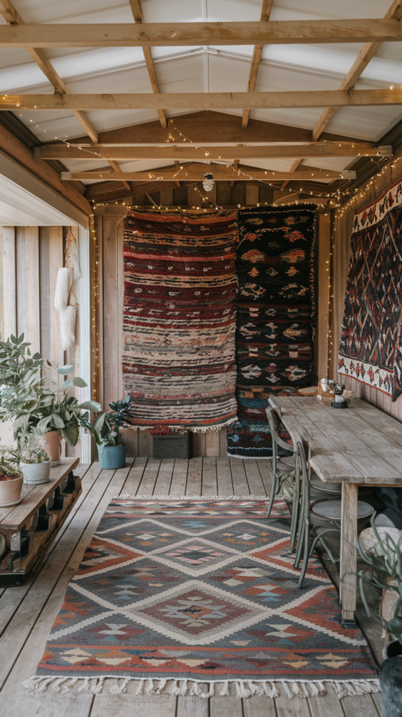 Layering woven jute or patterned boho rugs over hardwood floors creates an inviting and textured look. This method allows you to change up your style with different rugs seasonally. Mix textures and colors for a relaxed, artistic feel. It also adds warmth and comfort underfoot. Ideal for free-spirited or artistic she sheds.