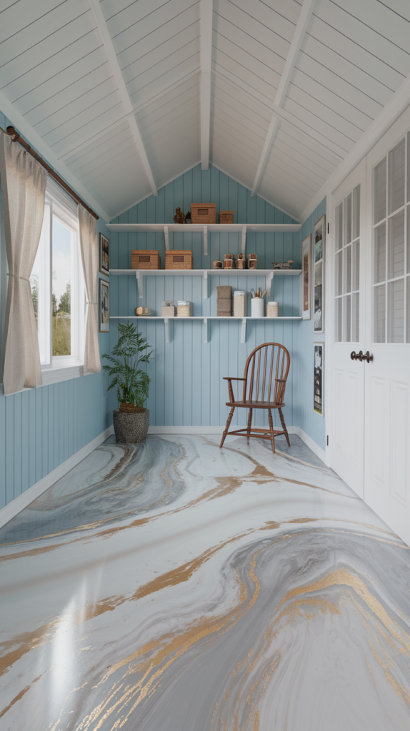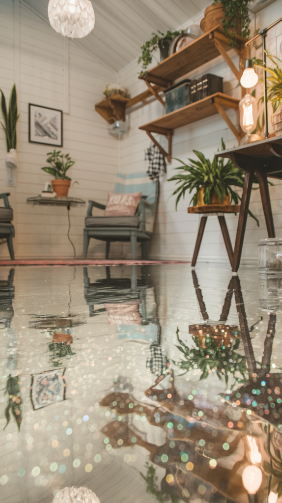 Create a dazzling effect by embedding fine glitter or metallic flakes into an epoxy resin floor. The glossy, high-shine finish reflects light beautifully, making your she shed feel like a luxurious escape. Choose subtle silver sparkles for a sophisticated look or go bold with holographic flakes for a magical touch. This flooring is not only eye-catching but also durable and easy to clean. Perfect for those who want a glamorous, modern retreat.