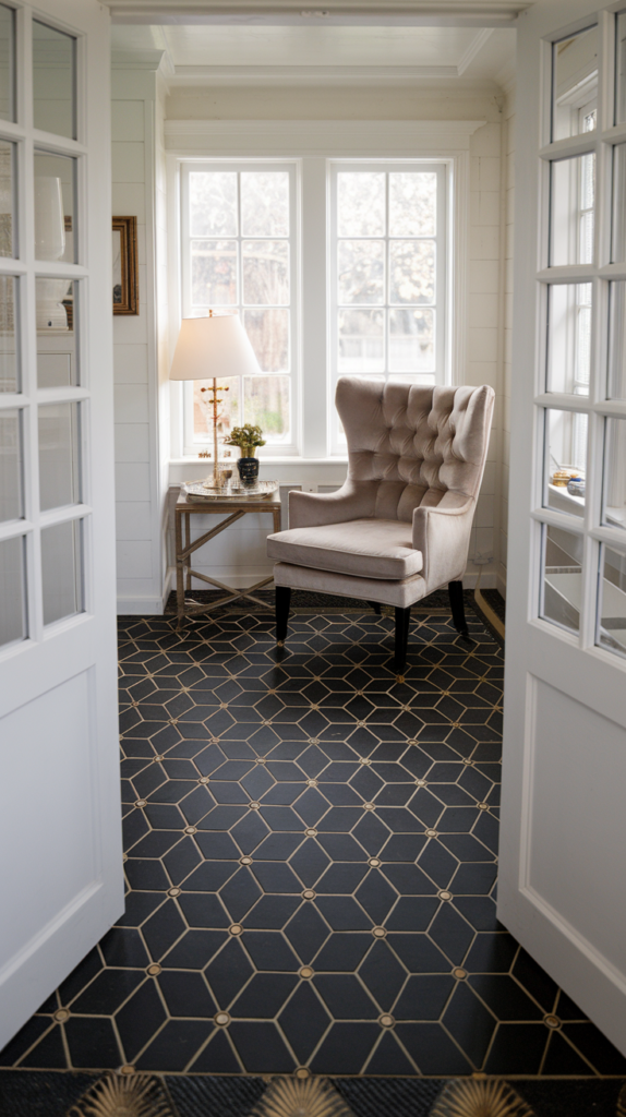 For a glamorous, vintage-inspired look, go with black and white patterned tiles in an Art Deco or Victorian design. This style adds a sophisticated touch, perfect for she sheds used as a tea room or creative writing space. The high-contrast pattern makes a bold statement while remaining timeless. Pair with gold accents and plush furnishings for a luxurious retreat. A flooring option that oozes elegance!