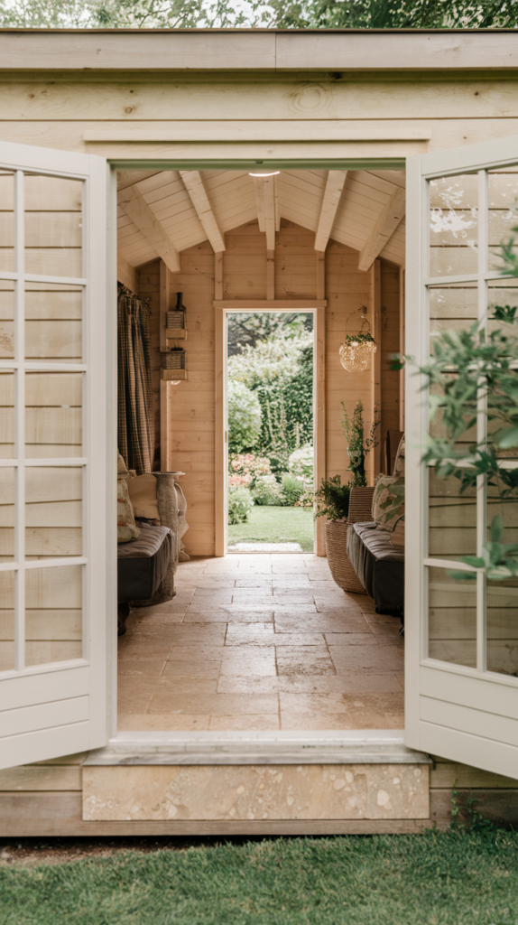 For a warm and timeless touch, consider using reclaimed brick pavers for your she shed flooring. The natural red and brown tones add texture and character. Seal the bricks for a smoother finish and easier cleaning. Perfect for a greenhouse she shed or vintage-inspired space. A durable and rustic flooring option that gets better with age.