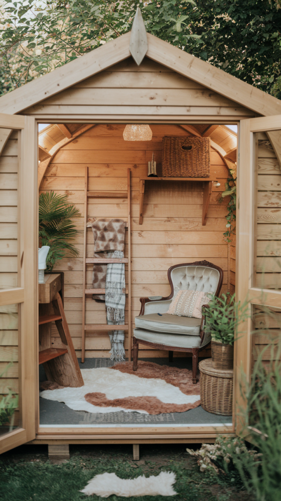 Instead of changing the flooring, layer faux fur and plush rugs for an ultra-cozy feel. Soft textures create a warm, inviting atmosphere, perfect for reading nooks or relaxation spaces. Use different shapes and sizes for a curated, stylish look. This approach allows for easy updates and seasonal changes. A budget-friendly way to make your she shed extra comfortable!
