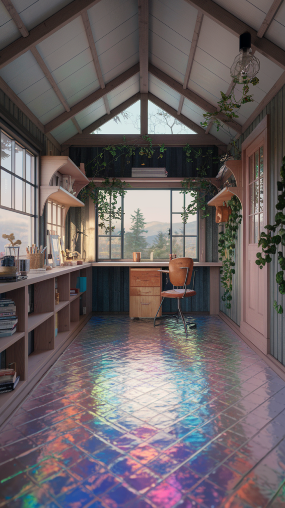 Transform your she shed with vinyl flooring that shifts colors as you move across it. This holographic effect adds a dreamy, futuristic vibe to art studios, meditation spaces, or creative retreats. It works especially well in areas with plenty of natural light, as the colors will shimmer and change throughout the day. The surface is smooth, waterproof, and easy to maintain. A bold, playful flooring idea that makes any space feel magical!