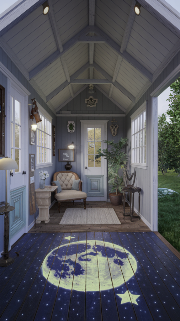 For a subtle surprise, paint small glow-in-the-dark designs—like stars, moon phases, or floral patterns—onto your floor. The glow effect charges in natural light during the day and softly illuminates your space at night. This is perfect for she sheds used as relaxation zones, reading nooks, or celestial-themed escapes. Pair with soft fairy lights for an enchanting nighttime atmosphere. A fun way to add an unexpected touch of whimsy!