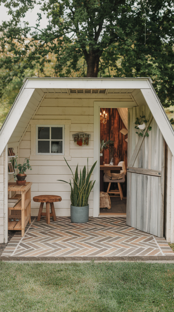 Elevate your she shed’s elegance with a herringbone wood floor design. Whether using natural hardwood or luxury vinyl planks, this pattern adds instant sophistication. The zig-zag arrangement draws the eye and makes even small spaces feel high-end. Pair with soft, neutral-colored walls for a chic and cozy retreat. A great flooring choice for those who love classic yet modern design.