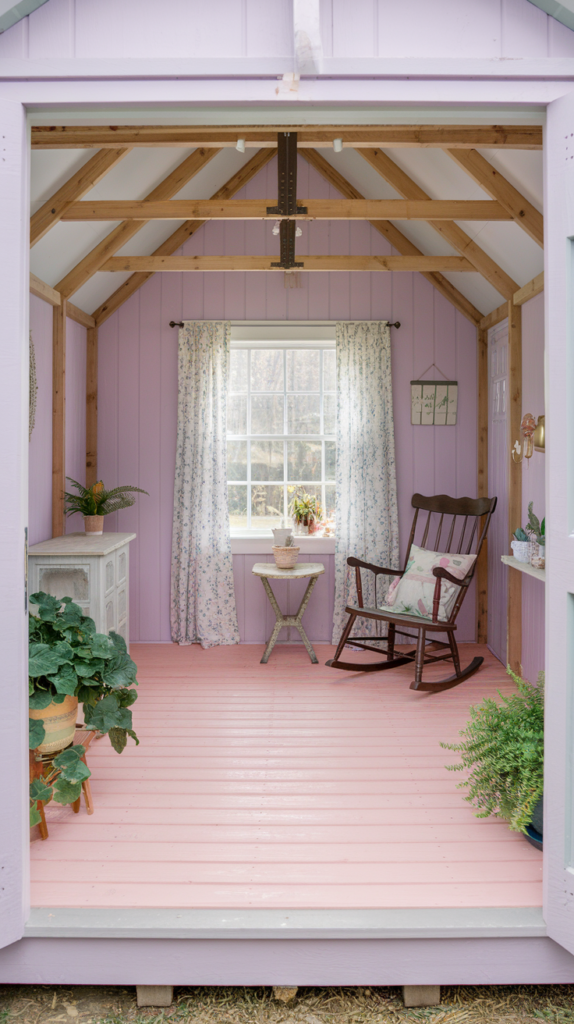 Instead of traditional dark wood stains, try soft pastel washes in pink, lavender, or mint green. This creates a whimsical, fairy-tale aesthetic that brightens the space without overpowering it. Light stains allow the natural grain of the wood to show through, adding warmth and texture. Seal the floor with a matte finish for a soft, velvety look. A charming choice for cottagecore, vintage, or shabby chic she sheds!