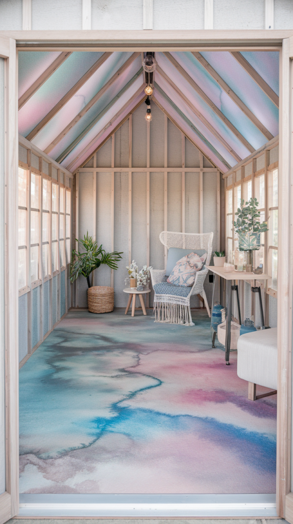 Give concrete floors a dreamy, artistic effect by layering translucent stains in blended hues. Soft blues, pinks, and purples mimic the look of watercolor paintings, creating a calming and ethereal feel. Once sealed, the finish is durable, smooth, and easy to clean. This flooring pairs beautifully with neutral or bohemian décor and works well in light-filled spaces. A beautiful choice for those who want their she shed to feel like a piece of art!
