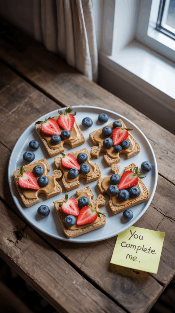 Cut slices of whole wheat bread into puzzle-piece shapes using a cookie cutter set (or carefully freehand with a knife—been there, done that). Spread a layer of almond butter or Greek yogurt on top, then arrange sliced strawberries and blueberries like a little edible art piece. The idea is that the toast only fits together one way—just like your crew fits together perfectly. I once made this for my daughter and wrote “You complete me” on a sticky note next to the plate. She still has it taped to her mirror. You can serve it disassembled so your kid can “solve” the toast puzzle before eating. Great if your kiddo loves hands-on breakfast ideas. And honestly, it’s just bread, fruit, and spread—but suddenly feels extra. Plus, it’s secretly packed with protein and fiber.