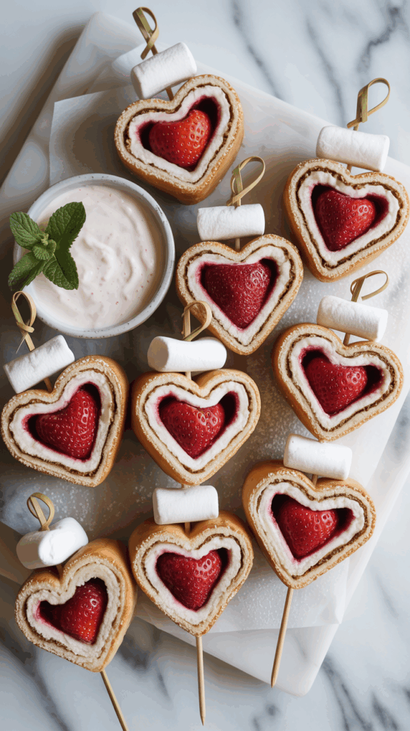 Take store-bought cinnamon rolls (yes, the kind in a can), unroll each one, then re-roll it into a heart shape before baking. Once they’re golden, thread them onto skewers with sliced strawberries and mini marshmallows in between. The result? A handheld cinnamon roll kabob that looks like something straight off a brunch menu. Add a drizzle of pink icing or dust with powdered sugar for extra charm. These are great for little hands, and they double as a cute table centerpiece if you’re doing a family Valentine breakfast. Bonus: You can prep the skewers the night before and just warm them up in the morning. Kids love the mix of textures, and you can swap in bananas or raspberries if strawberries aren’t their thing. Serve with yogurt dip on the side and call it Cupid’s Brunch Stick. It’s festive, fast, and way more fun than just a plain cinnamon roll.