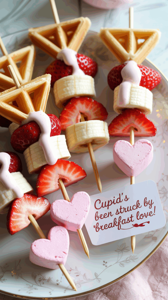 Use wooden skewers to build “Cupid’s arrows” with waffle triangles as the arrow tips and sliced bananas or strawberries as the shaft. Add a tiny marshmallow or heart-shaped candy at the end for the arrow tail. Lay them across a plate and drizzle with syrup or yogurt. They’re super visual and somehow way more fun than just eating the same ingredients in a bowl. You can even write a little tag that says, “You’ve been struck by breakfast love!” My youngest said it looked like food from a fairy tale. And if your kids are old enough, let them assemble their own arrows—it turns breakfast into a hands-on activity. These are ideal if you want Valentine-themed food for kids that doesn’t feel too sugary or over-the-top. Just waffles. On a stick. With love.