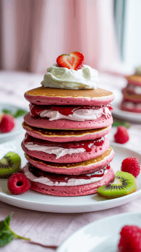Make small pink pancakes using beet powder or food coloring, then sandwich them with strawberry cream cheese and a thin layer of jam. Add a little whipped cream around the edges if you want to go full Valentine. It’s like a breakfast macaron, but way easier and less fussy. I make these with my niece every year and we call them “pillow pancakes” because they’re soft and fluffy like little clouds. You can even pop them in a lunchbox if breakfast is on-the-go. Use a heart cutter if you want to level it up. Serve with a few raspberries or heart-shaped kiwi slices for color. Totally kid-approved, and the kind of thing that looks way harder than it is.
